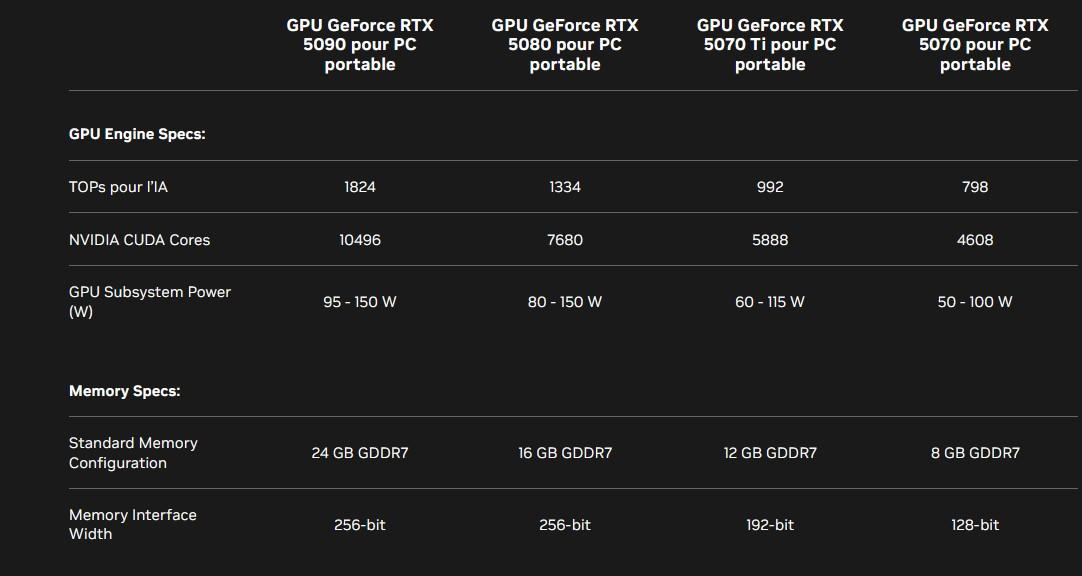 D’après ComputerBase, l’entreprise a expressément demandé aux concepteurs d’ordinateurs portables d’afficher le TGP de la carte graphique. Une précision certainement saine : les marges de manœuvre s’élèvent jusqu’à 70 W pour une carte telle que la RTX 5080. Cette référence a en effet une puissance configurable entre 80 et 150 W. Pour la RTX 5070, c’est carrément du simple au double, avec une plage de 50 — 100 W (ces écarts restent toutefois moins élevés que pour certaines RTX 40, puisqu’ils sont de 35 — 115 W pour les trois qui forment l’entrée de gamme).