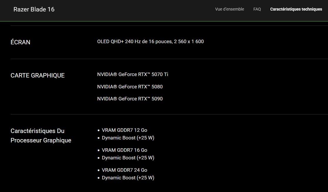 Pour un PC comme le Razer Blade 16 (2025) en revanche, la donnée se trouve dans la page « Vue d’ensemble » ; elle se borne à la RTX 5090.