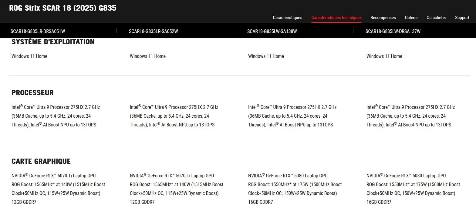 Des marques comme Asus, MSI et XMG semblent jouer le jeu. Le ROG Strix SCAR 18 (2025) par exemple affiche bien les puissances pour chaque GPU (c’était déjà le cas pour la version 2024 munie de RTX 40).