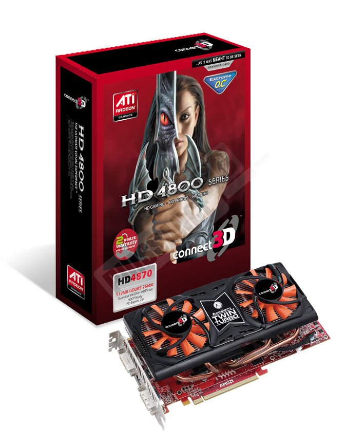 Connect3D vient de lancer sur le marché 2 cartes équipées du HD4870, l'une ayant 512Mo de GDDR5 et l'autre 1024Mo. Pour ceux qui hésitent et ne savent pas quelle version choisir, notre Puissexpress saura certainement les aiguiller. Autrement ces deux cartes sont overclockées d'usine à 770/950MHz pour le core et la mémoire. Toutefois c'est la présence de l'Arctic Cooling Twin Turbo qui fait leur originalité, puisque le dernier né de la marque est plutôt efficace et silencieux. La version 512Mo est d'ores et déjà disponible chez MagicPC à 263€.
