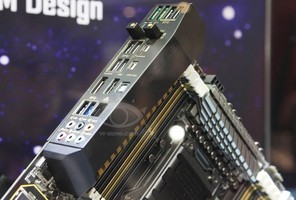 Huit slots DDR3 pour supporter jusqu'à 128Go de DDR3 (et non pas 64Go), un socket LGA 2011 qui accueille un CPU SB-E, un étage d'alimentation à 8phases et...deux GPU qui sont connectés sur les liens PCIe 3.0 x16 du CPU. Car c'est là que se trouve le "concept" de cette carte mère puisque vous pouvez voir ci-dessous des sorties vidéos HDMI, DisplayPort et Thunderbolt x2 (photo de droite) ainsi que les puces mémoires pour les GPU sur la photo de gauche.
