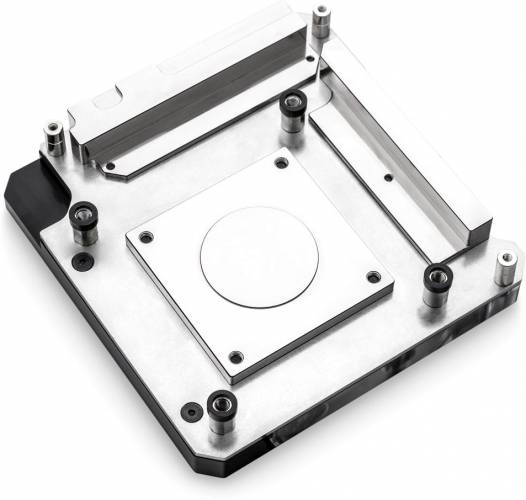 EK qualifie son waterblock EK-Momentum (Aorus Z390 Master D-RGB, de son nom complet) d'"all-in-one", c'est-à-dire qu'il s'occupera en fait non seulement de dompter les montées en températures des Core i8000 ou i9000, mais dissipera aussi la chaleur des MOSFTET autour du socket LGA 1151. De quoi pouvoir envisager des réglages peut-être un peu moins raisonnables lors des overclockings. EK explique aussi avoir moulé la base de son monobloc de sorte à fournir une surface de contact mécanique mieux optimisé pour l'IHS des CPU, résultant selon le constructeur en un échange thermique optimisé.