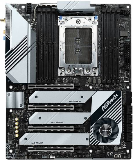 Mais ASRock a prévu un modèle plus sobre pour ceux qui veulent moins de brillance et préfèrent la technicité, en proposant sa TRX40 Creator - dont le nom est pompé de chez MSI probablement. La carte parait bien légère côté CPU, avec seulement 8 phases pour gérer les futurs monstres Threadripper et l'ajout là aussi d'un ventilateur sur le radiateur des VRM. Une carte basique vous allez nous dire ? Et bien non, car à côté l'équipement est plutôt conséquent : 4 ports PCIe 4.0 x16, puces Ethernet 10Gb/s (Aquantia) et 2,5 Gb/s (Realtek), Wi-Fi 6, USB 3.2 Gen2x2, double codec audio, 3 ports M.2 PCIe 4.0 x4... Nous sommes donc surpris qu'une carte mieux équipée que la Taichi soit aussi peu solide en apparence pour son alimentation, à voir sur le terrain ce que ça donne. Au passage, la carte n'est pas illuminée de base, ce qui peut être intéressant pour certains réfractaires aux licornes.