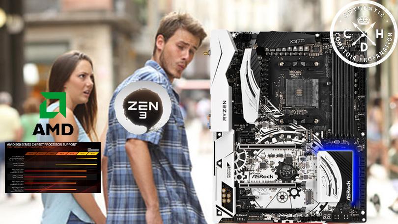 Comme toute entreprise à but lucratif, AMD aussi se doit de segmenter sa gamme un minimum, même artificiellement, et brosser ses partenaires dans le sens du poil - d'autant plus maintenant qu'il fait bon de profiter du désarroi du concurrent pour sécuriser des parts de marché. Ainsi, pour Zen 3, la compatibilité idéale se trouvera du côté des chipsets 500 (série introduite avec Zen 2 et qui n'a donc pas eu de successeur pour Zen 3), les cartes mères de série 400 seront compatibles sur la base d'un BIOS bêta et les propriétaires d'une mobale de série 300 vont malheureusement devoir se résigner à passer à autre chose si l'upgrade Zen 3 est envisagé. Concernant ce dernier point, la raison exacte n'a (de mémoire) jamais vraiment été avancée, on peut donc penser qu'il s'agit d'un mélange des arguments avancés ci-dessus.