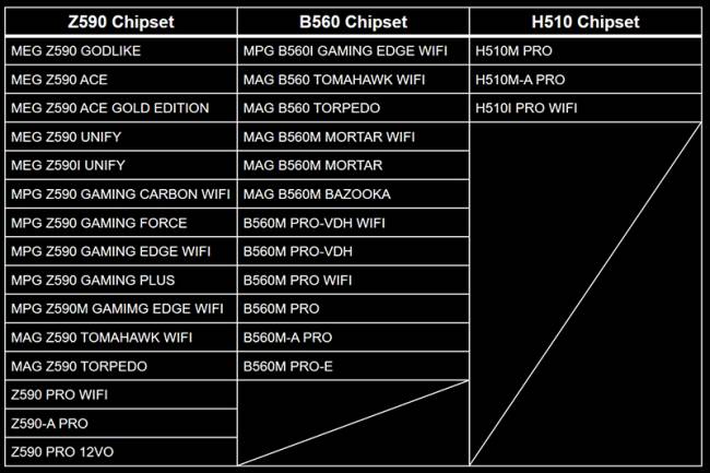 MSi ne ratera pas Rocket Lake, et va mettre sur le marché des tas de cartes mères à base de chipsets de la série 500. Avant de vous dévoiler la liste de tout ce qui doit arriver, on va retenir une info importante, ce serait le 27 janvier que les vannes seraient ouvertes. Cela ne confirme en rien les dates supposées de lancement pour Rocket Lake, prétendues pour fin mars. Chez MSi, on va donc fournir des cartes animées par les 3 chipsets attendus, Z590, B560 et H510. On va également retrouver les gammes au sein de chaque catégorie, avec du GODLIKE en haut de catalogue/bas de votre porte-flouze, du ACE, du UNIFY, du Gaming Carbon/Force/Edge/Plus, Tomahawk, Torpedo, Pro, Mortar, Bazooka.