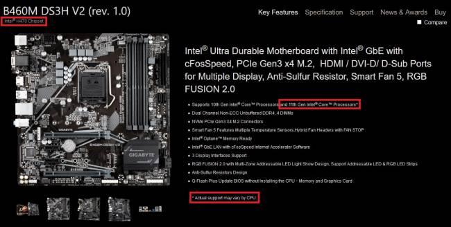 En attendant, dans la foulée de cette information, voilà que des cartes mères un peu bizarres ont fait leur apparition chez GIGABYTE. En premier, les H410M DS2V V2 et H410M S2H V2, succédant aux modèles originaux (1 et 2) sans suffixe « V2 » et a priori parfaitement identiques à ceux-ci, sauf que leur fiche technique respective annonce la présence d'un chipset H470, au lieu de H410 ! Ensuite, une B460M DS3H V2, virtuellement identique à la B460M DS3H originale, mais également équipée d'un chipset H470 et qui annonce cette fois-ci clairement une compatibilité avec la 11e génération Intel Core, mais en précisant que le support peut varier par CPU ! Ce dernier point rappellera cette brève, qui « confirmait » qu'une mobale H410 de MSI n'allait a priori supporter que les modèles Rocket Lake de 65 W. Notons que les 3 trois modèles révisés sont tous rangés dans la catégorie H470 du catalogue sur le site du constructeur.