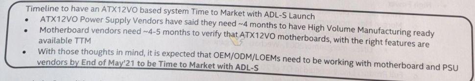 En tout cas, Intel ne serait pas près de lâcher l'affaire et voudrait absolument que l'ATX12VO devienne populaire. Il chercherait donc désormais à motiver une adoption en masse dans le cadre de sa prochaine génération Alder Lake-S ! Cette dernière aurait justement beaucoup à y gagner grâce à sa conception hybride avérée mélangeant des gros cores Golden Cove et des petits cores Atom Gracemont, Intel lui vante d'ailleurs déjà le meilleur rapport performance/watt pour un CPU desktop. Considérant une arrivée d'Alder Lake-S fin 2021, début 2022, et les 4/5 mois qu'il faut apparemment aux fabricants pour faire le nécessaire afin d'arriver à proposer des produits ATX12VO dans les temps pour Alder Lake, ce serait maintenant le moment ou jamais pour faire le forcing et convaincre les partenaires !