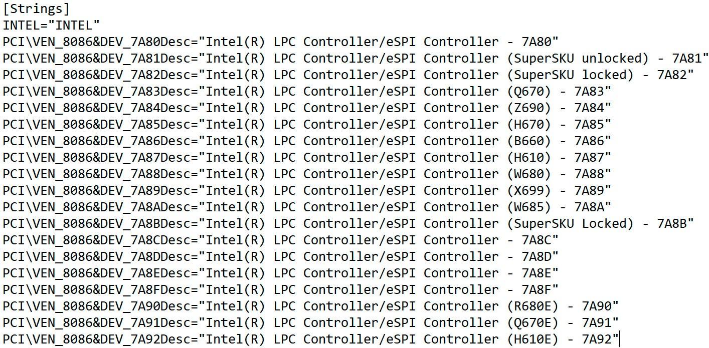 Dans cette longue liste (raccourcie) du fichier AlderLake-PCH-S détaillant le futur portfolio de solutions desktop d'Intel, on découvre une gamme mainstream menée par le flagship Z690, suivi d'un H670 et B660 pour le milieu de gamme, et un H610 pour servir le bas du tableau. En somme, pas vraiment de surprise, la nomenclature est dans la continuité parfaite de l'existant et l'on peut donc s'attendre à une segmentation assez semblable. Naturellement, des variantes Q et W — généralement les chipsets les mieux équipés du lot et avant tout destinés aux entreprises — existeront également, il s'agira des chipsets Q670, W680 et W685. Enfin, les versions des puces supputées prévues pour le marché « embedded » sont aussi mentionnées dans le tas, elles seront a priori au nombre de trois et se nommeront tout simplement R680E, Q670E et H610E. Évidemment, aucun de ces noms ne nous apprend absolument rien sur les fonctionnalités qu'il faut en attendre. Pour cela, il faut encore attendre un peu.