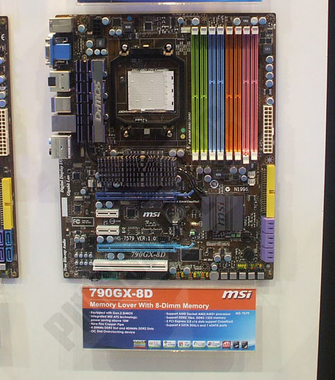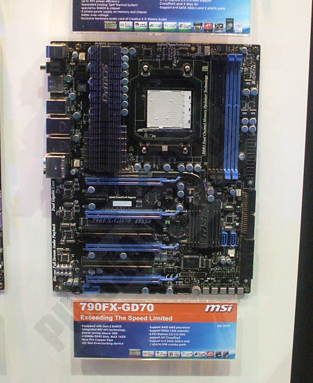 Les cartes AMD : l'AM2+/AM3 est de retour avec des cartes amusantes dirons nous. La première, la 790GX-8D propose à l'instar de sa soeur sur P45 pas moins de 8 slots DDR2 pour ceux qui en auraient besoin; elle se nomme la Memory Lover... L'autre carte qui a retiendu nos oeils (comment ça ce n'est pas français?) est la 790FX-GD70. C'est une carte purement AM3, qui présente surtout des interrupteurs sur le PCB afin d'overclocker via une molette, et plein d'autres options directement ajustables via la carte mère sans pénétrer le bios. notez que d'autres mères pour Intel proposent ce niveau d'équipement également.
