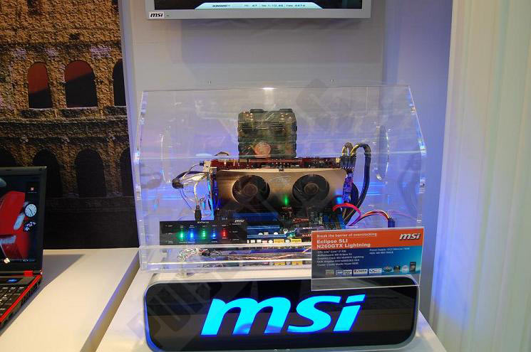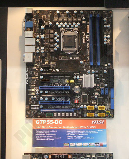 Les cartes P55 : Le Core i7 du peuple arrive et MSI ne compte pas laisser passer l'occasion de se montrer; Les G7P55-DC et G9P55-DC étaient présentées au public sachant que celles-ci comme nombre d'autres ayant d'autres chipsets actuels profiteront de technologies sympathiques. le 9 du nom indique un haut niveau de finition et de fonctionnalités tandis que le 7 indique une gamme plus abordable.