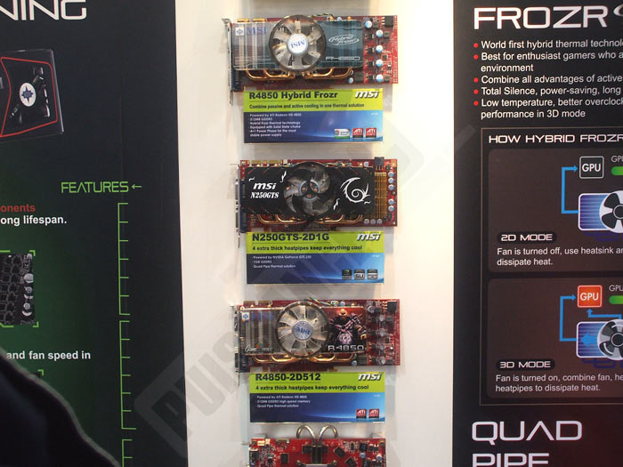 Seconde partie de notre visite chez MSI, voici les cartes mères et graphiques. Beaucoup d'activité sur ces segments qui constituent le moteur et la vitrine technologique. Jadis souffrant d'une image de matériel à la qualité douteuse, la marque s'est resaisie et essaye donc de faire changer les choses. Au rayon des cartes graphiques c'est assez classique en dehors de la GTX260 Lightning que vous avez déjà aperçue dans nos colonnes. Niveau cartes mères là c'est du lourd qui nous attend avec des technologies similaires aux concurrents et des gammes qui s'étoffent.