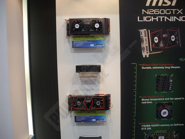 GTX260 Lightning : C'est une GTX260 ayant des critères de fabrication rigoureux, qui de surcroît possède 1792 Mo de GDDR3 sur bus 448 bits. Parmi son bundle qui reste à confirmer, on trouvera ou pas l'Air Force panel qui permet de monitorer via une baie les diverses constantes témoin de la santé de la carte. La difficulté pour MSI est à l'heure actuelle de déterminer un tarif qui place cette carte sous la GTX285, quitte à sacrifier ce panel. Pour les fréquences MSI se dirige vers 770 MHz pour le core mais rien n'est décidé. Enfin pour terminer le ventirad des photos n'est pas défini de manière sure, c'était donc un prototype qui était présenté.