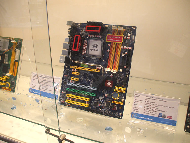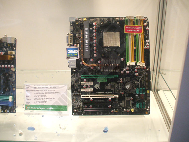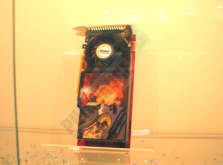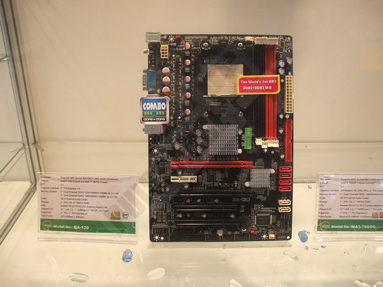 Jetway présentait lui aussi un stand dédié à ses activités, à savoir les cartes mères et graphiques. Du côté des gpus, une HD4850 s'est distinguée par son seul ventirad qui ressemble... à pas grand chose finalement, mais qui a le mérite de ne pas reprendre le mini barbeuq by Raymond d'ATi. Par contre ses cartes mères sont plus intéressantes. Tout d'abord un modèle P55 fera son arrivée avec les processeurs de la gamme Intel, répondant au doux nom de Hummer Studio. On peut espérer un prix bas pour ce modèle qui n'est pas richement équipé, mais ce n'est là pas vraiment la cible de Jetway. Ensuite deux cartes mères AM3/AM2+ pour Phenom II font leur apparition. Elles sont basées sur le 790GX+SB750 et sur l'AMD770+SB700. En tout état de cause elles ressemblent aux autres, sauf qu'elles permettent aussi de poser des barettes DDR2 OU DDR3 au choix, par paires et 2 maximum. En fait elles acceptent tout, ce qui est moins commun pour celle équipée d'AMD770+SB700. En revanche les produits de Jetway étant assez peu distribués en France, il va falloir batailler pour espérer en trouver chez nous.