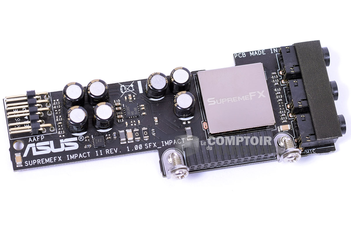 Petit changement pour la solution audio. Jusqu'à maintenant la série Gene avait une solution audio intégrée au PCB principal. Par manque de place ou tout simplement pour une meilleure isolation la partie audio a cette fois été déportée sur une carte fille comme sur la série Impact. Elle a même un petit nom cette carte "SupremeFX Impact II". Sous ce nom barbare se cache en fait une puce Realtek ALC1150, puce que l'on trouve un peu partout maintenant sur le moyen à haut de gamme. ASUS annonce sur son site que sa solution est compatible 8-Channel, sauf qu'il n'y a que trois prises Jack, Line In, Line Out et Mic In. Comment qu'on fait?