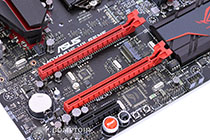 Entre les deux slots PCIe principaux se trouve un port M.2, il est uniquement compatible PCIe et seulement avec les formats 2260 et 2280. Pas de SATA Express, mais un connecteur mini-PCIe (tout en haut à gauche au-dessus de l'I/O) permet d'accueillir un module combo Wi-Fi+BT vendu séparément par ASUS.
