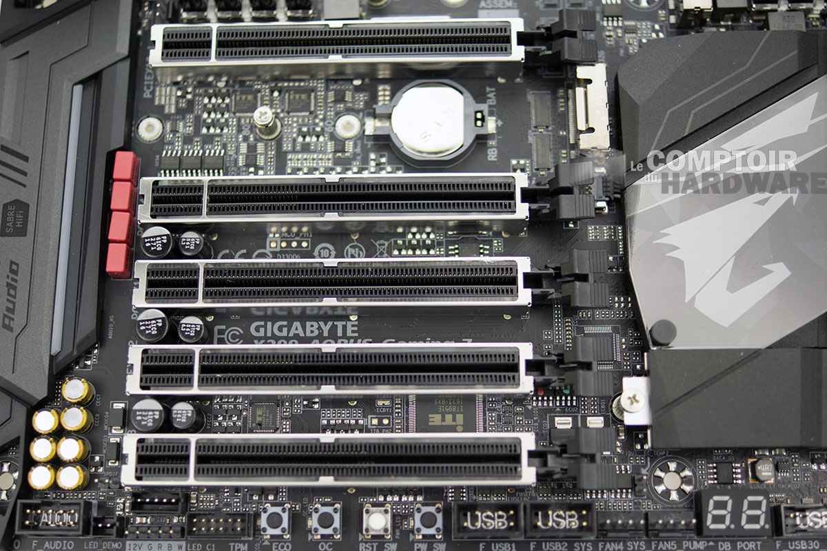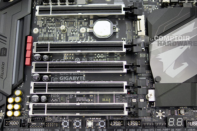 Petit zoom sur les ports PCIe 16x dédiés aux cartes graphiques, GIGABYTE les a, comme ses compères MSI et ASUS, renforcés. Ils seraient, selon le fabricant, 4,8 fois (c'est la guerre à celui qui pissera le plus loin à ce niveau maintenant) plus résistants à l'arrachement qu'un connecteur traditionnel, une valeur particulièrement importante mais totalement invérifiable... On notera également juste au-dessus de l'afficheur Debug à LED, le port M.2 disposant d'un dissipateur passif sous le radiateur du X299.