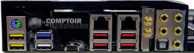 Du côté panneau arrière, à côté des 4 USB 3.0 (jaune/bleu/blanc ce dernier servant à Q-Flash Plus), sont présents 5 USB 3.1 Gen 2 (via ASM 3142) dont un utilisant le connecteur type-C réversible, ainsi qu'un mini PS2 et les prises audio gérées par une puce Realtek ALC1220 couplée à un DAC ESS Sabre (DNR 121 dB) et des condensateurs Nichicon. À cela s'ajoutent 2 ports Gigabit Ethernet animés respectivement par une puce Intel i219-V et Killer E2500, ainsi que les connecteurs pour les deux antennes Wifi raccordées à une puce Killer Wireless-AC 1535.