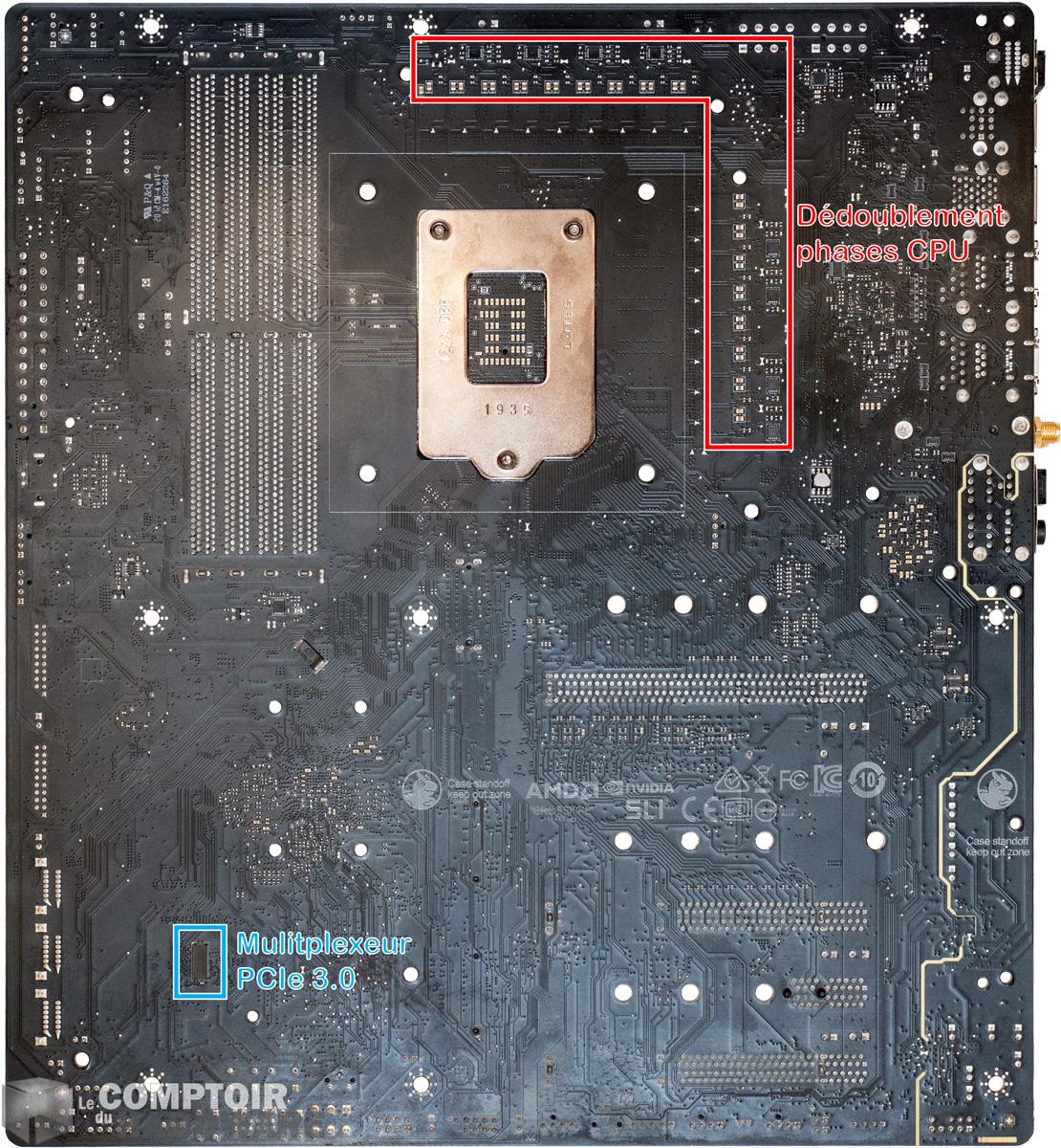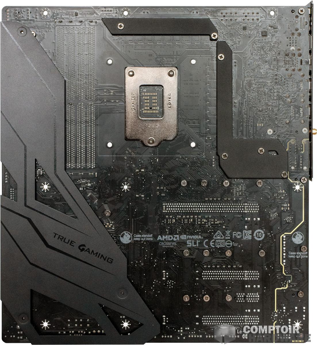 Une fois que l'on enlève le bon gros kg d'aluminium présent sur la carte mère, celle-ci dévoile un PCB complet, mais qui n'exploite que très peu le double face. Cela étant, les composants présents sont d'un top niveau, avec notamment un circuit réseau bien pensé, de nombreux éléments pour garantir un signal PCIe stable sont là et une implémentation correcte des composants est mise en œuvre pour éviter les interférences possibles. Si les ports PCIe du CPU sont prévus pour du PCIe 4.0, il faudra cependant que le CPU soit compatible, ce qui n'est toujours pas le cas sur Comet Lake.