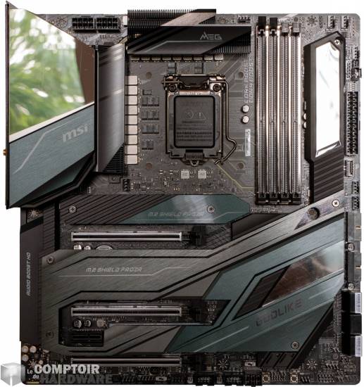 MSI ne fait pas dans la sobriété avec son modèle haut de gamme, et cherche à en mettre plein la vue avec une grosse dose d'aluminium et de miroirs. Et pour autant, le style n'est pas trop flashy, car la peinture unie en gris permet de rendre le résultat harmonieux. Il faudra par contre avoir un boîtier adapté, la carte étant au format eATX. Nous avons ici 4 slots pour 4 barrettes DDR4, question ports, comptez sur 1 PCIe x16 3.0, 1 PCIe x8 3.0 (partagé avec le x16), un PCIe x16 3.0 lié au chipset - donc en 4.0 - et 1 port PCIe x1 3.0, rien de très nouveau depuis Z390.