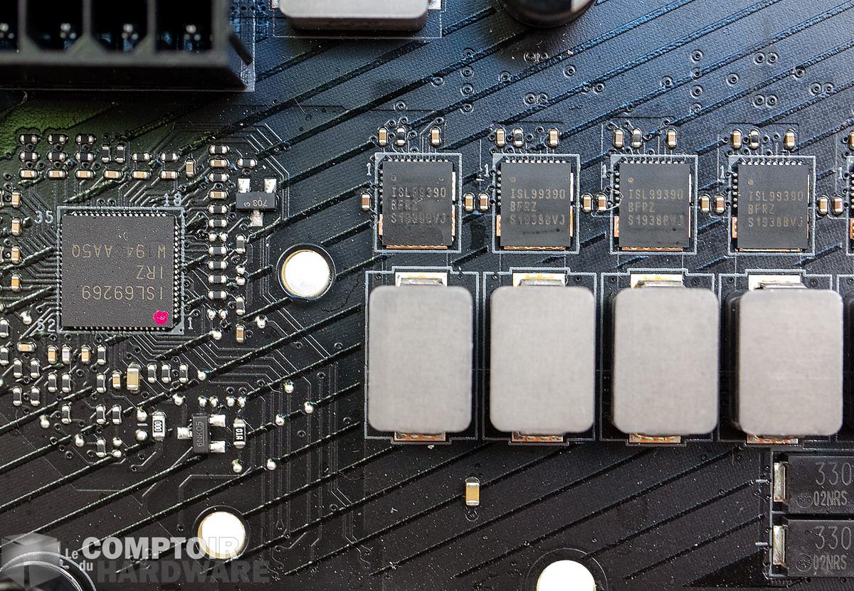 Tant qu'à parler son, le système de refroidissement des VRM est particulier, puisqu'il comporte 2 ventilateurs de 30 mm chacun. Dans 80 % des situations, il y a des chances que ceux-ci ne s'activent pas, mais à charge lourde ils pourront se mettre en route de manière soutenue.