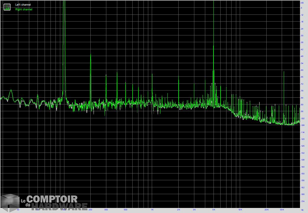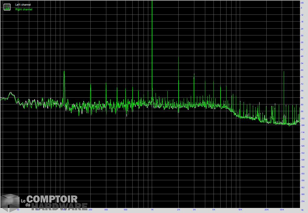 Si le niveau du bruit de fond est léger, nous notons tout de même la présence de pics de bruit sur les 100 Hz et ses harmoniques. Il doit s'agir d'une mauvaise construction des pistes qui captent de légères perturbations d'ondes électriques, ces fréquences correspondant à des parasites créés par les alimentations reliées au réseau EDF. En dehors de cela, les résultats sont corrects, sans plus ; et la distorsion du signal parait contenir principalement des harmoniques impaires (une fois le bruit enlevé). Cette décomposition du signal sonore risque de rendre le son dur à écouter, bien que la faible dose d'IMD devrait le rendre plus intelligible.