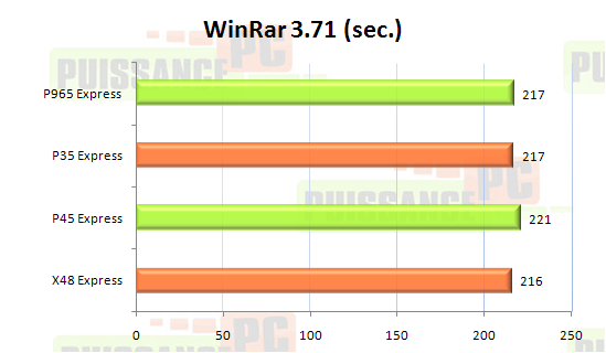 Et une égalité de plus pour la 4, une! Voyons à présent la compression d'un fichier image (Ghost) de 600Mo via Winrar 3.71. A nouveau les résultats sont exprimés en secondes et donc la valeur la plus faible est la meilleure.