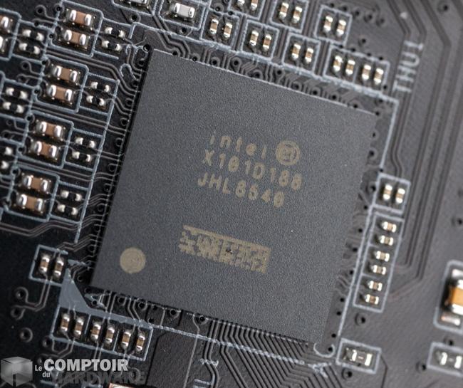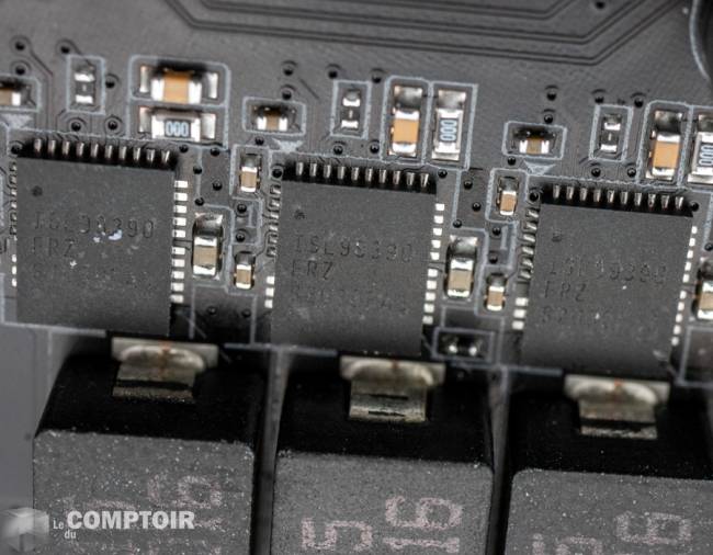 L'alimentation n'est pas en reste malgré la petite taille, avec 8 phases pures pour le CPU et une phase pour le SoC, le tout piloté par le contrôleur ISL69269 de chez Renesas et assuré par des MOSFET ISL99390 du même fabricant. Chaque unité peut tenir en théorie 90 A, mais les selfs ne sont pas aussi solides, elles seront surement limitées à 60 A, voire 45 A vue leur taille. Toutefois, cela restera suffisant, et nous pouvons déjà être sûr qu'un gros CPU pourra tenir la cadence sans soucis, à condition de ne pas trop relâcher la bride sur les limitations de puissance.