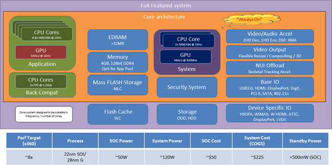 D'un point de vue hardware, si le document dit vrai et que les choix technologiques n'ont pas bougé depuis, Microsoft viserait des performances absolues environ multipliées par 8 pour sa nouvelle console, comparé à la Xbox 360 (4 à 6 en jeux). Pour ce faire, l'architecture de la Xbox 720 serait dispatchée en plusieurs zones de traitement. La principale, celle dédiée aux applications/jeux, reposerait sur un CPU de 6 à 8 coeurs ARM/X86, cadencé à 2GHz. Il serait associé à un GPU de 64ALU moulinant de son côté à 1GHz. Mais ce n'est pas tout, puisqu'un second couple serait lui entièrement occupé à faire tourner le système, avec cette fois 2 coeurs ARM/X86 à 2GHz pour le CPU et un GPU de 48ALU à 500MHz. Un 3e CPU serait même présent, avec 3 coeurs PowerPC à 3.2GHz pour assurer spécifiquement la rétrocompatibilité des titres dédiés à la Xbox 360.