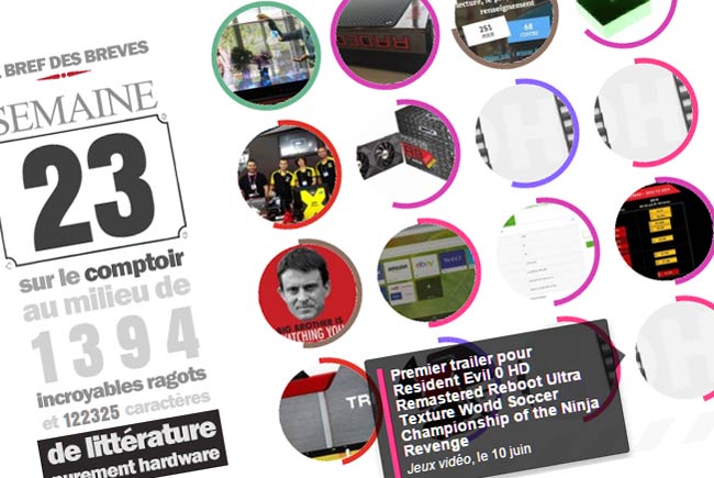Le principe est donc simple : sortir chaque dimanche une sélection de 16 billets qui auront connu le plus de succès durant la semaine, un peu à l'image du focus qui met en avant des actualités faisant réagir sur les 48 dernières heures que vous pouvez trouver en haut à droite de la page d'accueil, mais à l'échelle hebdomadaire. Comme nous sommes des stars du web design, on vous présente ça sous une forme circulaire bordée d'une rondelle dont la longueur est proportionnelle à la starisation de la brève concernée. Vous pouvez retrouver sur la gauche le nombre de ragots postés sur la période et même le nombre de fois où l'équipe du Comptoir a du frapper ses claviers pour vous tenir informés de l'actualité brûlante et passionnante du hard mondial. Oui : c'est merveilleux. Bon dimanche à tous !