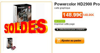 Permettons nous d'être cyniques le temps d'une news... Voici un solde qui est pour le moins impressionnant, mais pas dans le bon sens du terme. Ainsi Grosbill.com propose en ce moment même un solde sur une HD2900Pro 512Mo, dont le prix de base est de 149.90€ ce qui indique donc qu'il s'agit certainement d'une version 256bits. Bon la situation est maintenant posée, et il est temps de parler du prix soldé en lui-même et qui est de... roulement de tambour... 148.99€ ! Moins d'un euro, et pour parler en pourcentage puisque c'est de rigueur durant les soldes, voici donc une réduction de 0,6%. Un record qui ne sera pas facile à battre, mais si vous vous sentez de relever le défi pour trouver 0.5% ou moins n'hésitez pas. Aller un screen pour mémoire de ce qui sera peut-être le pire solde d'hiver 2008 en hardware: