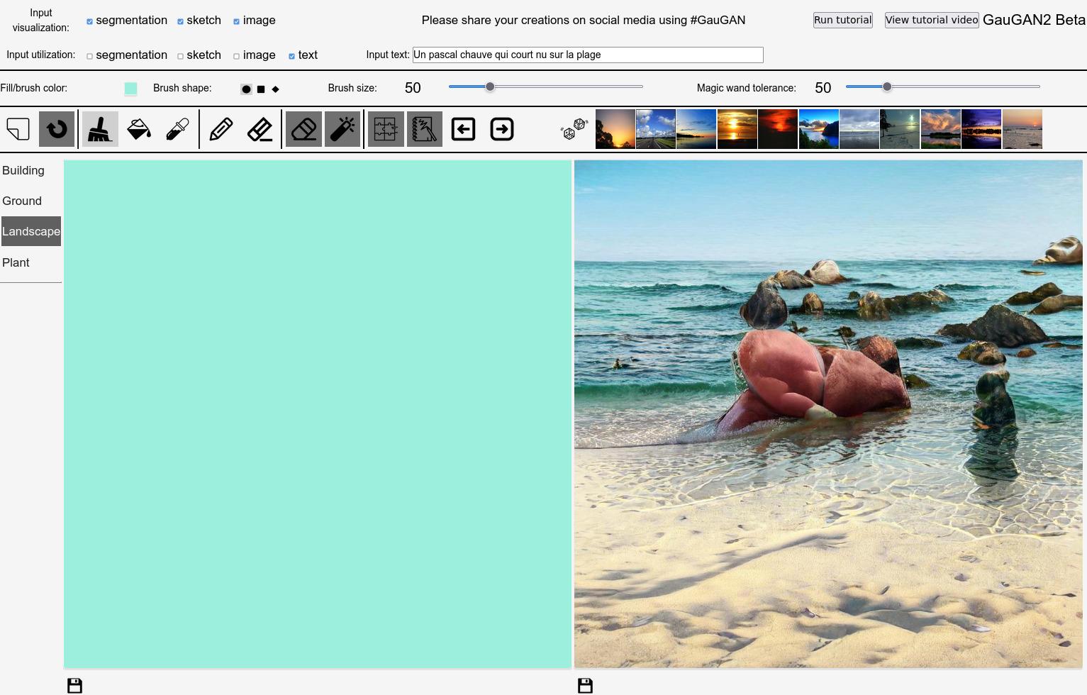 Après un premier projet de recherche, les verts ont développé une application-jouet de démonstration, et même un logiciel dédié : NVIDIA Canvas. L’idée est, bien entendu, de vanter les technologies développées par la firme et, ainsi, promouvoir son matériel — nous pensons directement aux technologies de machine learning intégrées dans Photoshop ; cependant, le projet continue à se développer côté recherche expérimentale avec, dernièrement, l’ajout d’un moteur de compréhension de texte. Au lieu de se farcir la création d’une image de qualité MS Paint avant de la transformer en une quasi-photo par IA, il est désormais possible de décrire une scène textuellement et voir quasi instantanément son interprétation par le GauGAN.
