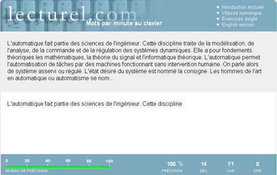 Aller une petite news amusante en ce week-end. Voici en effet un site qui a mis en ligne une petite application vous permettant de tester vos compétences dactylographiques, pour faire plus simple : votre vitesse et précision de frappe. Le prinicpe est simple : un texte aléatoire vous est proposé, et vous devez le retaper dans le cadre du dessous, le plus rapidement possible, sans faire d'erreurs (sinon vous devez corriger avant de pouvoir continuer. A la fin un message vous indiquera alors votre vitesse de frappe en mots par minute, ainsi que le nombre de corrections que vous avez dû faire.