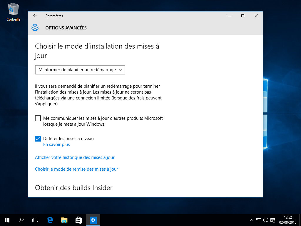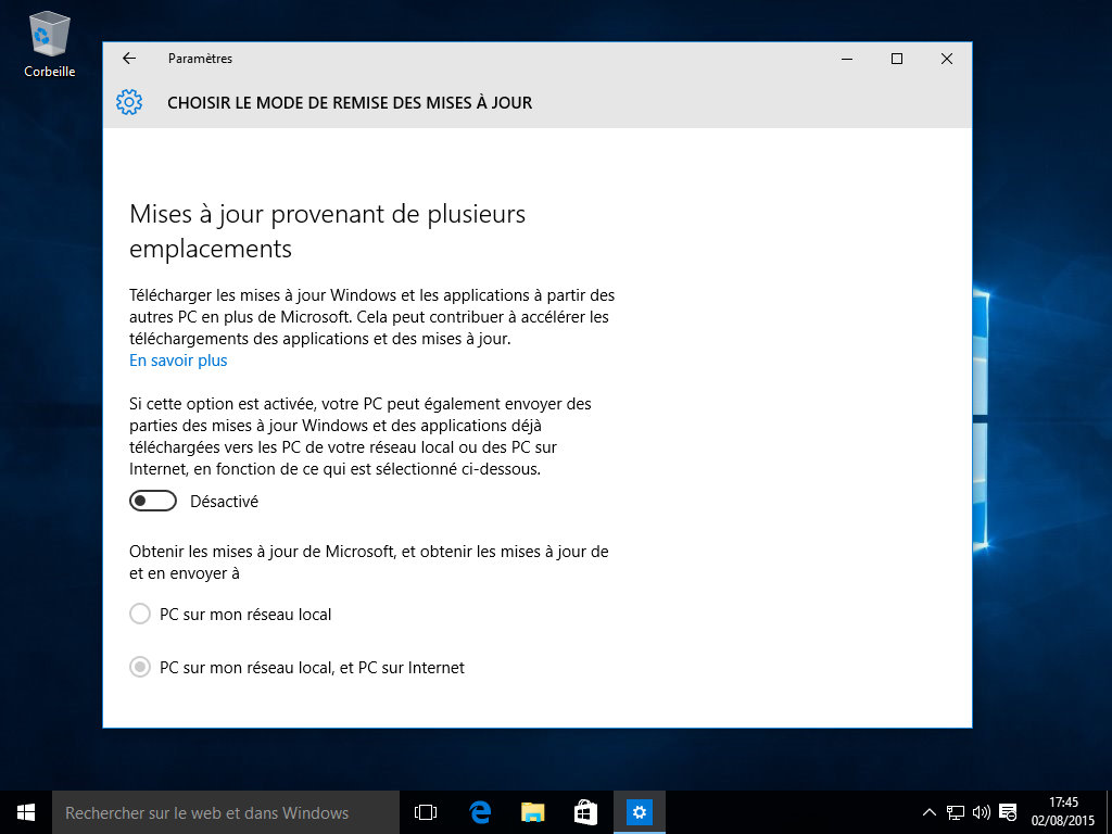 Une fois dans l'outil, on se rend compte que les options sont loin d'êtres nombreuses et c'est pourquoi un menu "Options avancées" existe. Une fois à l'intérieur, le premier point à régler est le mode d'installation des mises à jour. Voulez-vous que l'OS le fasse de lui-même ou choisir quand cela se fera ? C'est aussi ici qu'il vous sera possible de différer les mises à jour, si par exemple vous avez peur qu'une nouveauté vienne rendre votre système instable et préférez y accéder une fois tout problème écarté. Le second point à régler nécessite de cliquer sur "Choisir le mode de remise des mises à jour". Dans ce menu, vous pourrez désactiver le P2P si vous ne voulez pas participer ou juste le limiter à votre réseau local, permettant ainsi aux autres PC de votre domicile (ou lieu de travail) l'envoi des mises à jour, évitant ainsi de pomper la connexion pour rien lorsque toutes les machines font leur mise à jour.