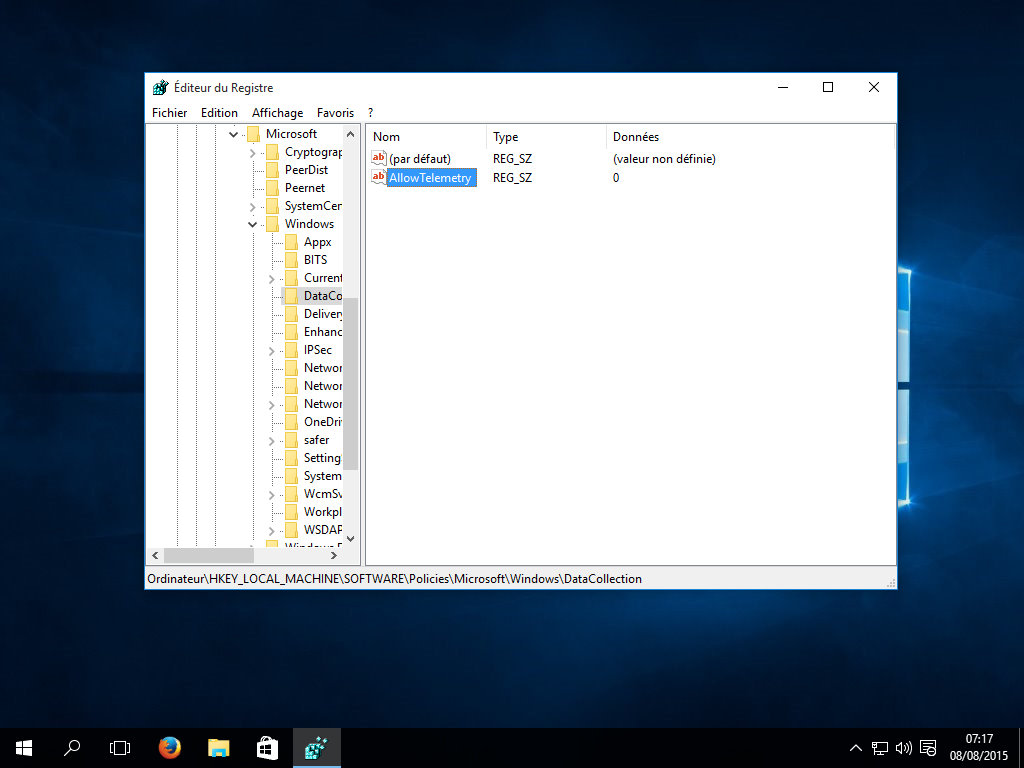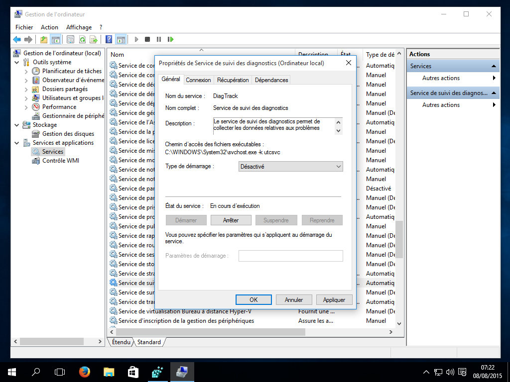 Premièrement, il faut se rendre dans le registre système (exécuter → regedit) et se rendre à l'emplacement "HKEY_LOCAL_MACHINE\SOFTWARE\Policies\Microsoft\Windows\DataCollection". Ici il faudra créer une valeur DWORD que vous nommerez AllowTelemetry et passerez à 0 (zéro). Une première bonne chose de faite, maintenant il faut désactiver ce petit monde au niveau des services. Ouvrez le gestionnaire de services (exécuter → services.msc) et désactivez "Service de suivi des diagnostics" (la collecte de données) et "dmwappushsvc" (le keylogger). Un petit redémarrage de la machine et vous voilà libéré de ces deux fonctionnalités de Windows 10.
