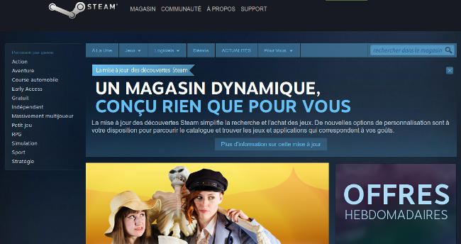 Il y a quelque temps les "Tags" ont fait leur apparition, ainsi que la possibilité de noter et donner son avis sur les jeux que l'on possède. En se servant de ces données et du contenu actuel de votre bibliothèque (types de jeu, temps passé sur chaque titre, succès réalisés...) et de celle de vos amis, Steam propose maintenant une liste de recommandations encore plus personnalisée, en plus de la possibilité de configurer l'affichage de l'accueil en fonction des besoins. Ils ont aussi rendu au passage l'accès aux promotions du moment plus simple avec carrément un encart réservé à droite de la page. Si vous arriviez encore à résister ou à rater quelques offres, cela va certainement devenir plus difficile avec ces changements.