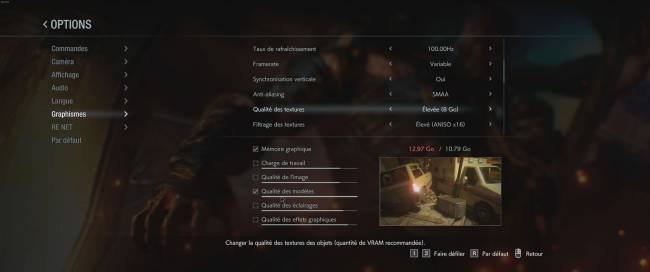 La démo de Resident Evil 3 est disponible sur PC depuis deux jours. Vu le travail accompli sur le RE2, grâce au très bon moteur RE Engine, on ne se fait pas trop de souci sur la qualité technique du titre à venir. À vrai dire, le jeu propose le même type d'options, y compris celle de la qualité des textures qui pompe joyeusement dans la VRAM comme en atteste notre image ci-dessous.