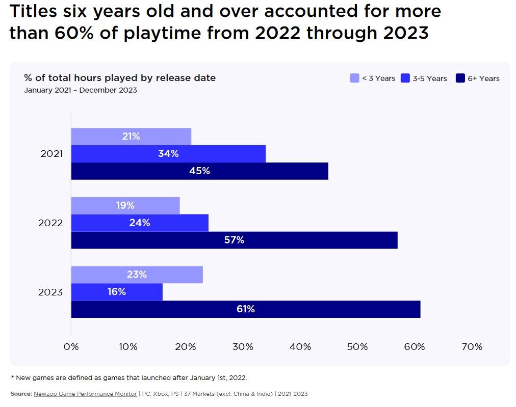 Le rapport annuel sur les jeux vidéo PC et consoles publié par la société d'études de marché NewZoo dresse un bilan assez intéressant de ce secteur. Il témoigne d’une croissance plus mesurée en 2023 qu’au cours du début de la décennie actuelle – forcément marquée par la pandémie de coronavirus. Mais surtout, d'un manque de renouvellement : en ce qui concerne la quantité d'heures accumulées, les jeux les plus populaires ne sont pas les plus récents, loin de là . Sur PC par exemple, l’âge moyen des dix premiers jeux de 2023, en utilisateurs actifs, est de 9,6 ans ; il est supérieur à 7 ans sur les consoles Microsoft (Xbox Series, Xbox One) et Sony (PS5, PS4).