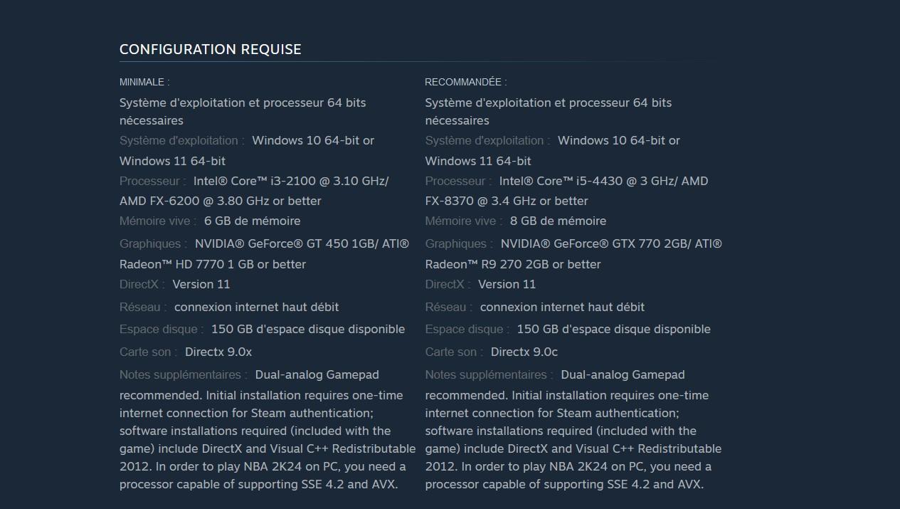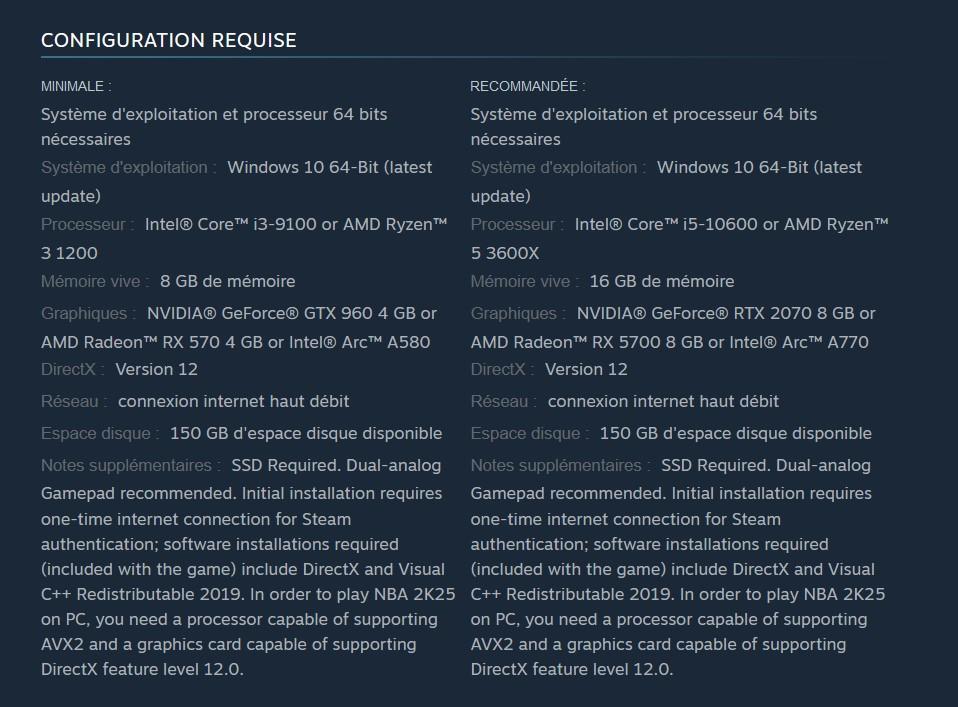 Par ailleurs, NBA 2K25 sera, comme ses prédécesseurs, disponible sur Steam. La plateforme de Valve a déjà mis en ligne les configurations minimale et recommandée. La transition vers l’édition current gen – ou new gen pour faire plaisir à 2K – implique un niveau d’exigence matérielle un peu plus élevé, sans toutefois atteindre des sommets.