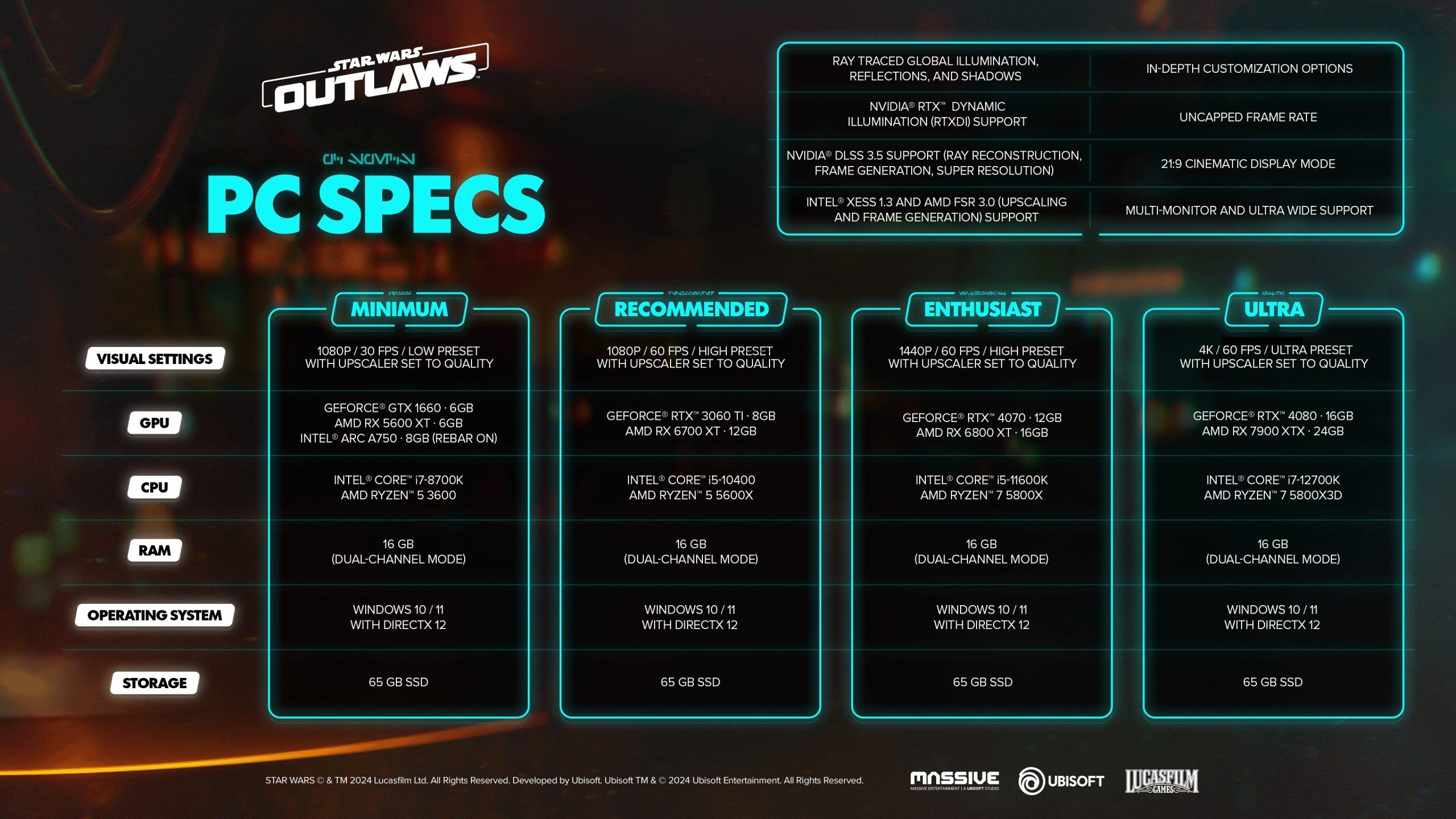Le studio avait dévoilé plusieurs configurations PC pour Star Wars Outlaw précédemment. Vous les trouverez ci-dessous. Le soft est assez gourmand. La config minimale, qui implique du 1080p / Low à 30 images par seconde, requiert une GeForce GTX 1660, RX 5600 XT ou Arc A750 associée à un processeur Intel Core i7-8700K ou AMD Ryzen 5 3600 avec 16 Go de RAM. Idéalement, pour du Full HD, tablez sur une RTX 3060 Ti ou RX 6700 XT et un Core i5-10400 ou Ryzen 5 5600X. Pour de la 4K / Ultra, prévoyez une RTX 4080 ou une RX 7900 XTX et un Intel Core i7-12700K ou Ryzen 7 5800X3D. Enfin, le titre occupe 65 Go d'espace disque.