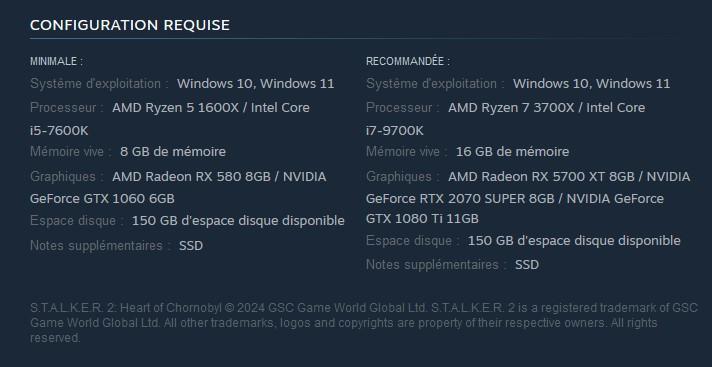Pour stocker sa grande map, S.T.A.L.K.E.R. 2: Heart of Chornobyl nécessitera beaucoup d’espace disque : les configs renseignées sur Steam mentionnent 150 Go. Prévoyez également au minimum un processeur AMD Ryzen 5 1600X ou Intel Core i5-7600K, une carte graphique AMD Radeon RX 580 ou NVIDIA GeForce GTX 1060 et 8 Go de RAM.