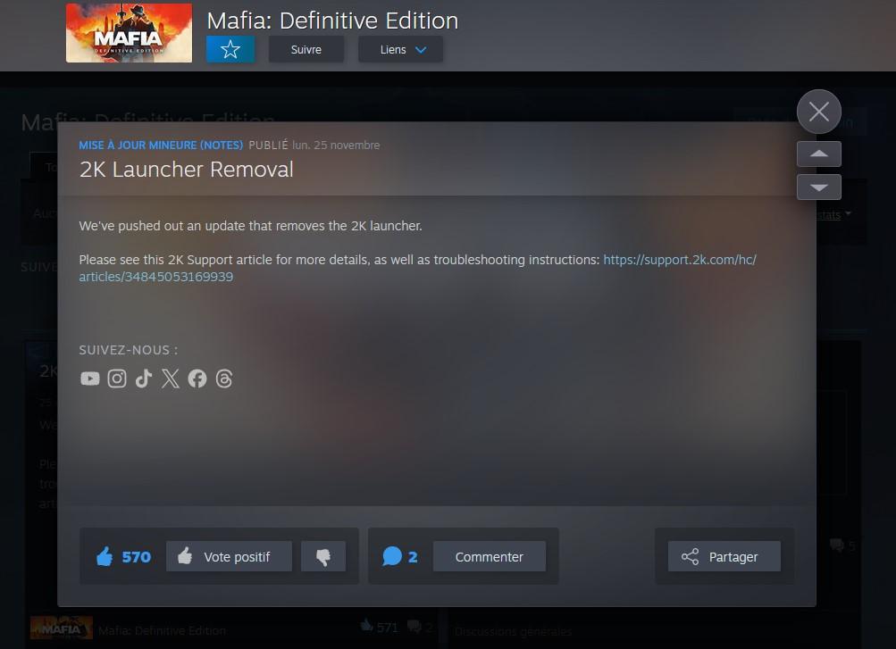 Le trépas n’est pas inattendu. Une certaine Little Sister, engeance à l'évidence tout droit sortie de Bioshock, avait annoncé cette condamnation le 28 octobre. Elle stipulait qu’à « partir du 18 novembre 2024, le launcher 2K sera retiré de tous les jeux qui l'utilisaient sur Epic et Steam ». Cela dit, sur les jeux concernés, à l’image de Mafia: Definitive Edition, le retrait n’est effectif que depuis hier.