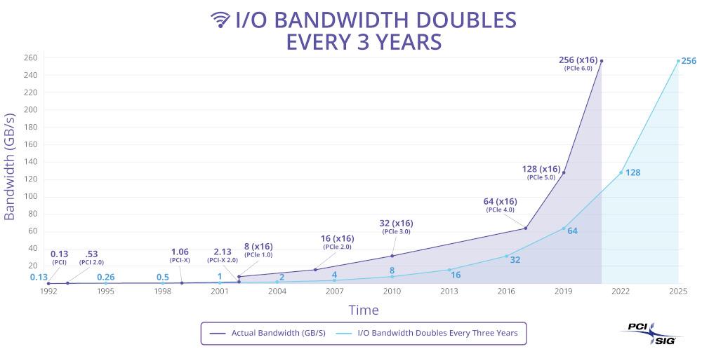 Alors que le PCIe 5.0 est tout juste au début de standardisation, la mouture 4 à son intégration dans le chipset X570, voici des nouvelles du... PCIe 6.0, sortez les trompettes ! Non, il ne s'agit pas d'un canular, mais du consortium PCIe qui a du se mettre un sérieux coup au derrière, peut-être pour concurrencer les inteconnects maison devenus un peu trop gênant comme l'Infinity Fabric, l'Intel UPI / DMI ou encore le NVLink. À moins qu'il ne s'agisse de l'inverse : les constructeurs ont besoin de plus de bande passante, et par un heureux hasard, le consortium leur fournit une base sur laquelle développer leur surcouche propriétaire.