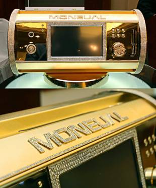 À droite, encore une création de chez MJ Studio, un « superordinateur » plaqué or et qui aurait alors embarqué une sorte de système cryogénique... Curieux, mais on a pas réussi à trouver plus d'information sur cet engin a priori particulier sur le papier. À gauche, le « sublime » Moneual 701 Jewelry , une création coréenne remontant à 2009, la belle époque Core 2 Duo, ATI Radeon HD 4000 et Windows Vista. C'est d'ailleurs ce qu'embarquait cette machine, en plus d'un « superbe » écran LCD 800 x 480, des haut-parleurs et un lecteur DVD-R ! En somme, une vraie machine multimédia tout-en-un polyvalente, mais certainement pas portable, le Moneual 701 pesait 35 kg, incrusté de 3554 pierres Swarosky, et un mélange de panneaux en or et en laiton. La pièce était proposée pour la modique somme de 30 000 $, aujourd'hui parfaite pour le musée ou les collectionneurs.