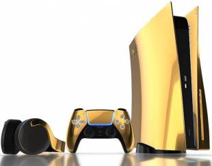 Peu d'infos sur la souris et la clé USB, si ce n'est qu'il s'agissait encore d'une création du fameux studio MJ, clairement abonné à transformation luxueuse de hardware mondain. On imagine que la surface entièrement recouverte de pierres - Swarovsky ou vrais diamants, allez savoir - devait être bien agréable sous la main. Autant un objet d'art que de décoration, plus qu'une souris vraiment utilisable ? À gauche, retour au presque présent avec une nouveauté bien récente, un kit PS5 avec la console en question, deux manettes et le casque Pulse, mais tous customisés avec de l'or 24 carats, ou de l'or rose ou du platine. Une création par l'anglais Truly Exquisite, limitée à 250 exemplaires par article et finition, et des prix pouvant aller jusqu'à 10 500 $, comme pour le kit montré en photo.