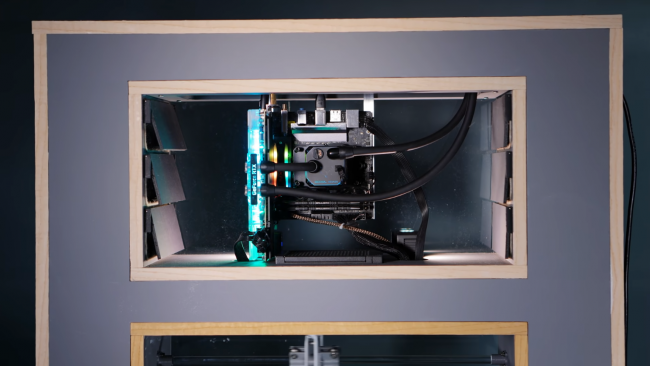 Pour ce faire, tout le matériel du PC a été placé dans un compartiment plus petit intégré sur le dessus du grand boitier. Celui-ci a été équipé de clapets antiretour des deux côtés ne s'ouvrant que pour recevoir l'air frais expulsé de la partie inférieure et restant fermés lors de la phase d'aspiration pour empêcher les retours d'air réchauffé. L'air ainsi insufflé à chaque mouvement est ensuite expulsé naturellement par le haut du petit boitier et à travers le radiateur du circuit à eau, évacuant au passage la chaleur produite par les plus gros composants du matériel : un Ryzen 9 5950X et une RTX 3080. Et figurez-vous que ça fonctionne apparemment très bien, le matériel aurait à peine dépassé les 60°C lors de passes sous Prime 95 pour le CPU et Furmark pour le GPU ! Il va de soi que le système imaginé et conçu par DIY Perks n'est évidemment pas des plus pratiques dans sa forme actuelle, rien que par son volume et ses dimensions, ce n'est clairement pas une alternative commercialisable telle quelle. Néanmoins, l'idée mériterait peut-être d'être explorée par les fabricants - si ce n'était déjà fait dans leurs labos. Dans tous les cas, chapeau bas à Matt de DIY Perks pour cette création originale !