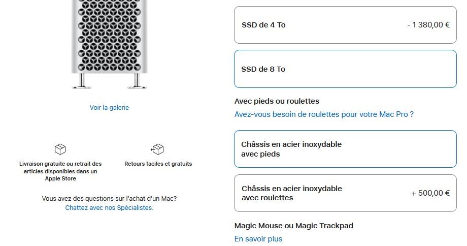 L’une des critiques souvent adressée à Apple a trait aux tarifs. Encore aujourd’hui, un Mac Pro au format tour coûte la bagatelle de 8 299,99 euros, minimum. Bien que les Mac Pro toutes options à plus de 60 000 euros appartiennent au passé, un modèle M2 Ultra peut faire grimper la facture à plus de 15 000 euros. Or, si le surcoût paraît légitime pour certains composants, il parait l'être beaucoup moins pour d'autre : qu'un châssis à roulettes plutôt qu’à pieds alourdisse la facture de 500 euros nous surprend toujours. Enfin, même l’entrée de gamme, à l’image d’un MacBook Air, coûte tout de même au moins 1 299 euros.