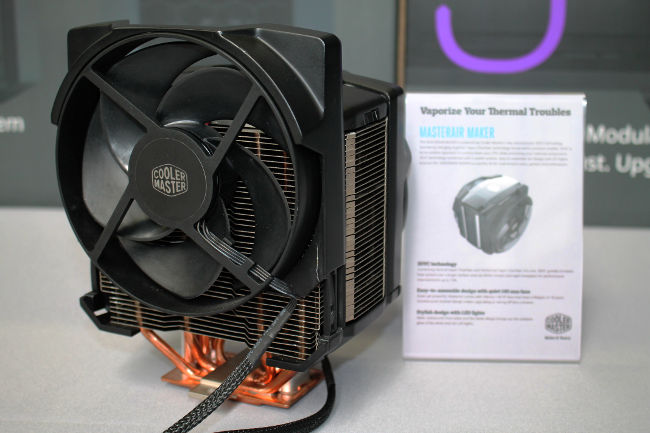 On sort des périphériques pour revenir sur un sujet où Cooler Master a fait ses preuves, les ventirads. Le MasterAir Maker est un très gros dissipateur combinant une chambre à vapeur dans sa base et huit caloducs en U en contact direct avec le processeur et traversant le radiateur de part et d'autre. Les ventilateurs sont des Silencio 140 FP et ils ont la particularité d'êtres montés sur des rails, ce qui permet de les régler en hauteur pour éviter tout problème de compatibilité avec la RAM, même si cela rehausse ce grand ventilateur d'autant. Pas plus d'info à son sujet, mais on devrait rapidement en savoir plus.