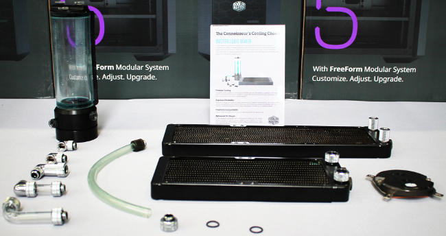 Toujours dans la dissipation, voici le kit MasterLiquid Maker qui permettra de débuter dans le monde du watercooling, tout en ayant tout ce qu'il faut pour bien s'intégrer dans les MasterCase. Pour l'instant à l'état de projet, le seul point bien arrêté est que la pompe peut être déplacée sur le réservoir pour pouvoir poser l'ensemble dans la position qui vous conviendra le mieux. Du tube, des coudes, des radiateurs, un waterblock, tout y est même si rien n'est encore en version finale.