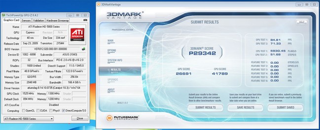 Quelques benchs plus tard le verdict est tombé au benchmark phare du moment pour valider les records : P30542 à 1500/1300, ce qui ne constitue pas le record du monde HD5870, placé à P31007 avec une Lightning, mais obtenu uniquement grâce à l'usage d'une configuration bi-hexacore Xeon et donc un score CPU démentiel.