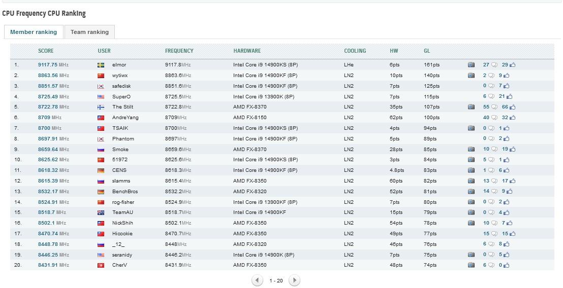 En mars, peu après la sortie du Core i9-14900KS, une équipe d’overclockeurs d’Asus composée notamment de Elmor, SkatterBencher et Shamino, a poussé le vaisseau-amiral d’Intel à 9 117,75 MHz. Ce record trône désormais sur le classement HWBOT, mais n’a en revanche pas encore été validé par CPU-Z (dont les responsables ont invalidé plusieurs records de puces Intel par le passé, comme celui de Gigabyte à plus de 8 GHz en 2021). Qu’à cela ne tienne, les deux premiers overlockeurs susmentionnés ont été invités au siège d'Intel afin de parler de ce qu’ils qualifient de premier OC CPU à plus de 9 GHz ; SkatterBencher a récemment mis en ligne la vidéo de présentation.